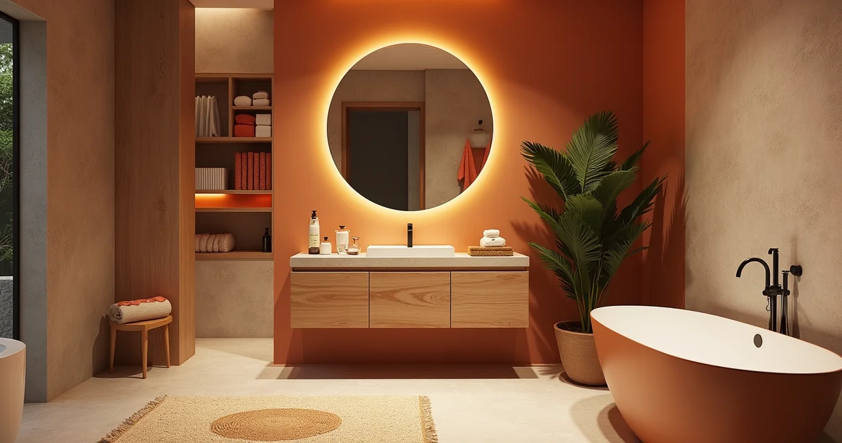 Formas Orgânicas em Detalhes: Pense em espelhos com bordas arredondadas, vasos com curvas suaves. Essas formas trazem um toque de aconchego e quebram a rigidez das linhas retas, algo que vemos muito em decorações de banheiros.