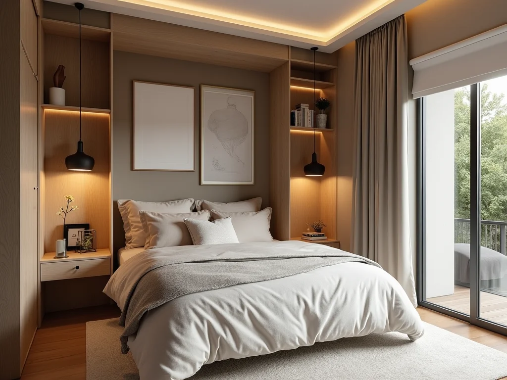 Dica Prática: Use prateleiras flutuantes acima da cama para livros e objetos decorativos, mantendo a circulação livre.