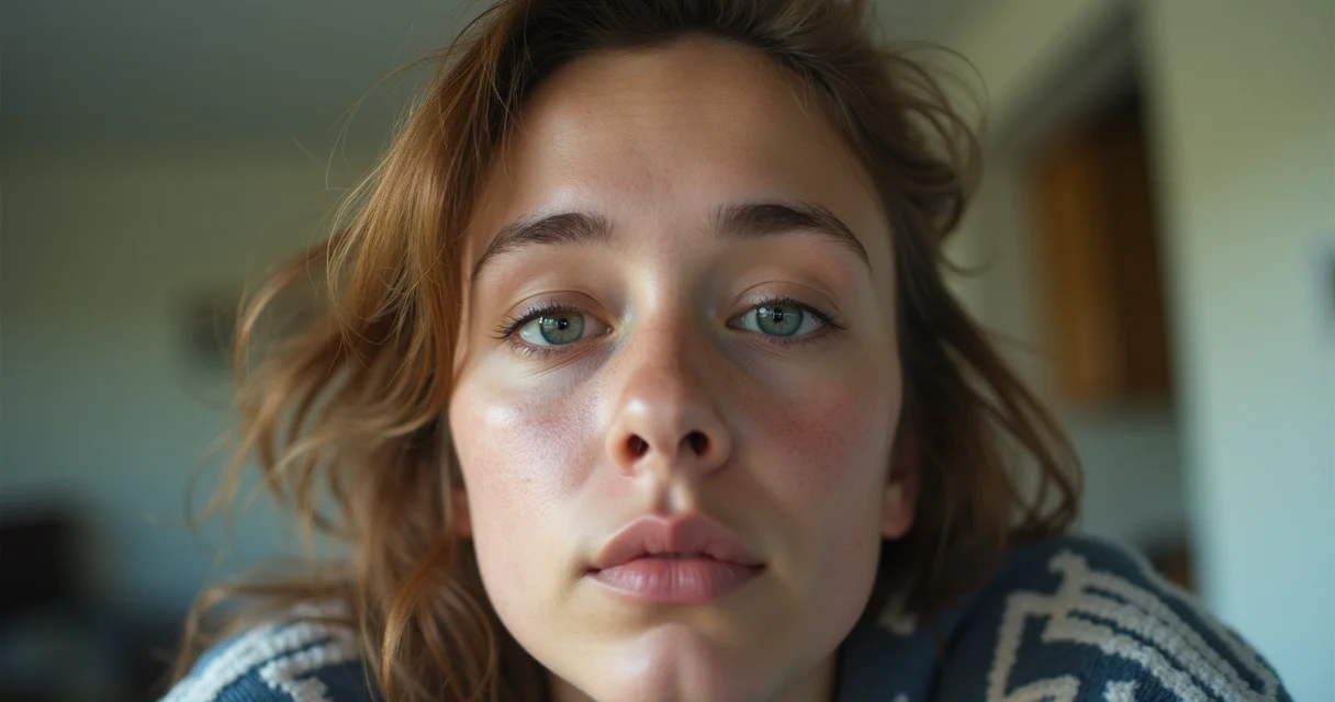 Mulher em close-up, iluminação suave lateral, fundo desfocado em tons terrosos, cabelo castanho ondulado caindo sobre o ombro, expressão serena, usando blusa de algodão bege.
