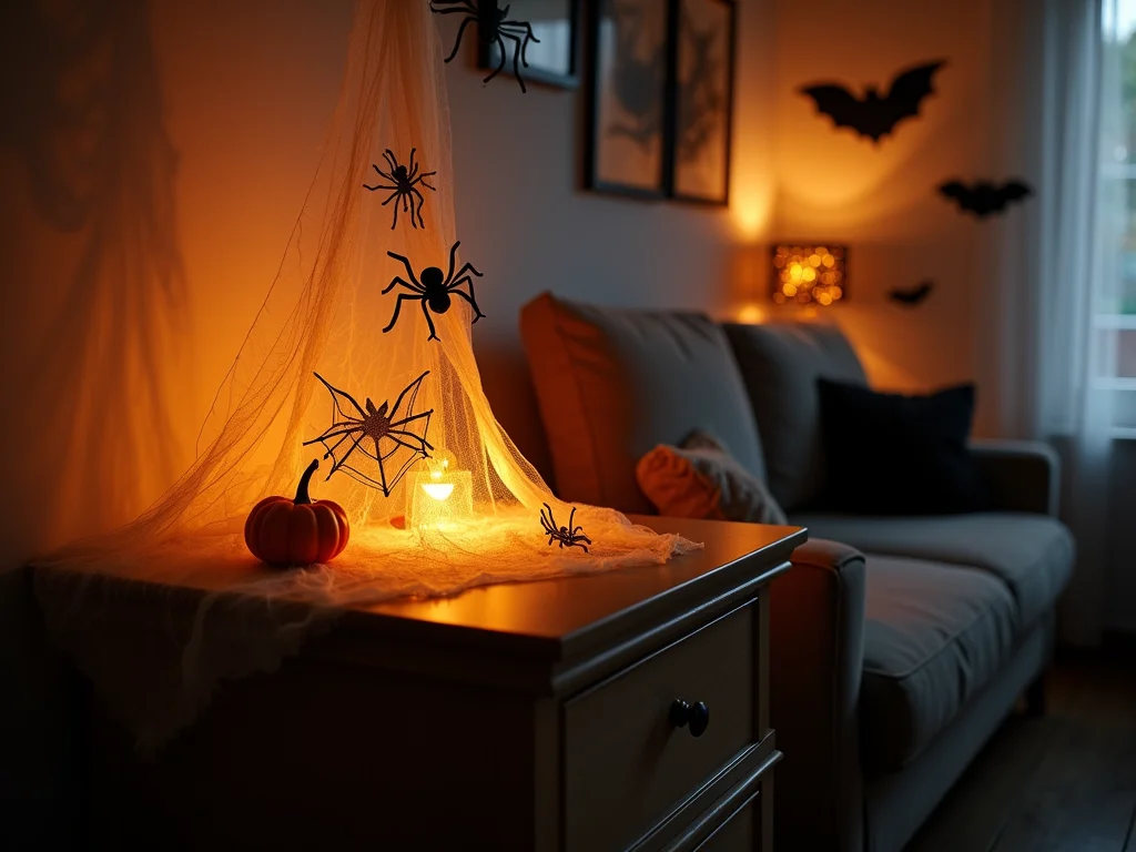 Teias de aranha falsas que cobrem móveis e cantos.
