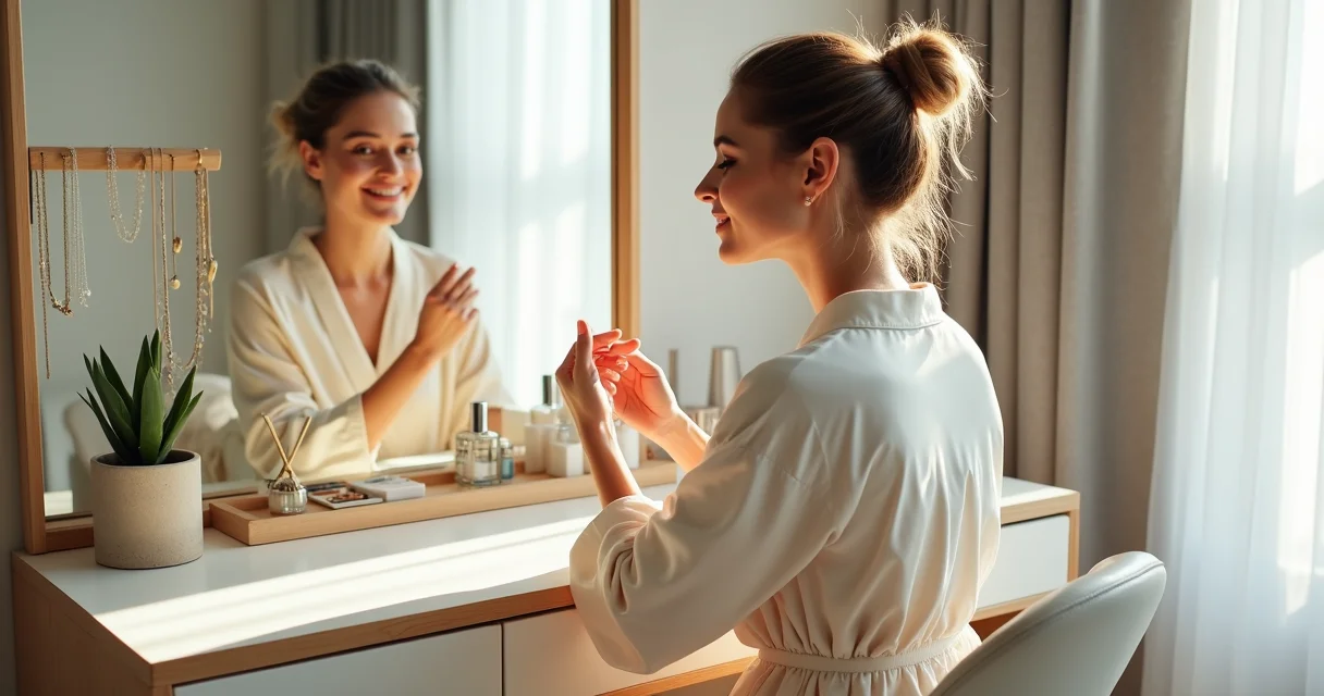 O grande segredo? A penteadeira moderna não é só um móvel bonito. É uma estação de trabalho inteligente para sua autoestima.