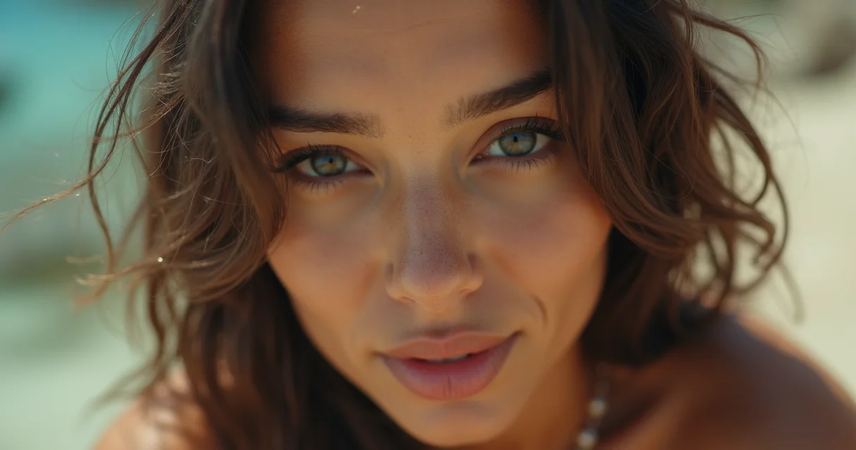 Close-up do rosto de Raphaela Sirena, com maquiagem leve e natural, pele com leve brilho, focando nos olhos expressivos.