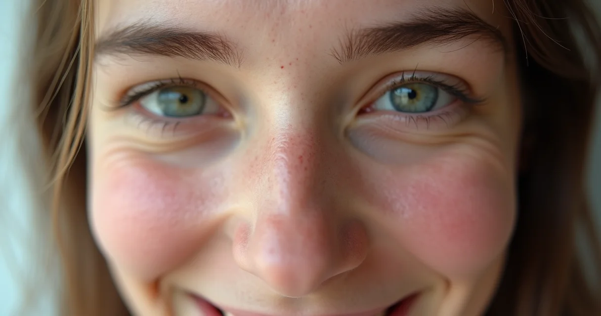 Rosto de uma mulher com maquiagem natural, destacando um blush rosa maquiagem aplicado suavemente nas maçãs do rosto.