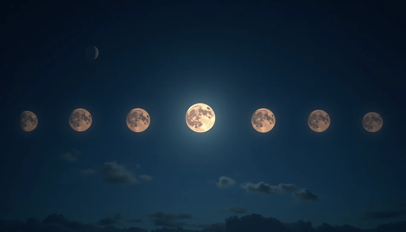 Visão de nove luas em diferentes fases, dispostas em um arco semicircular contra um fundo azul profundo, com estrelas cintilantes ao redor.