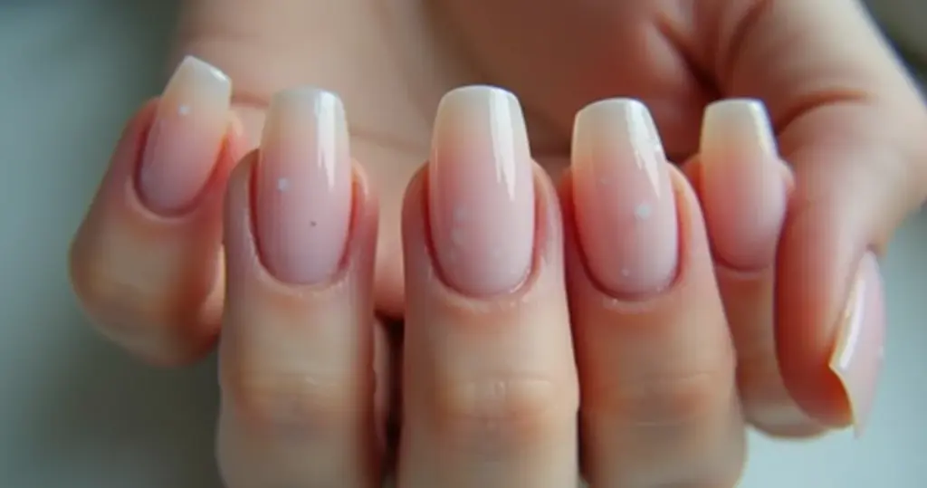 Mão com unhas de gel pequenas em formato de meia-lua, esmalte nude com brilho perolado discreto.